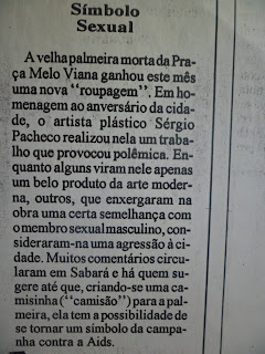 A intervenção sobre a palmeira aguçava a curiosidade dos transeuntes com seus olhares questionadores. A imprensa local manifestou interesse àquela minha expressão. Fotografaram minha ação, fizeram perguntas pertinentes à obra em conclusão. Facilitei o trabalho da imprensa com o meu release, mas publicaram um texto totalmente distorcido, ironizando e ignorando tudo que eu havia dito com maior seriedade. Achei uma estupidez! Não temos uma imprensa sensível e muito menos culta. - Pensei.